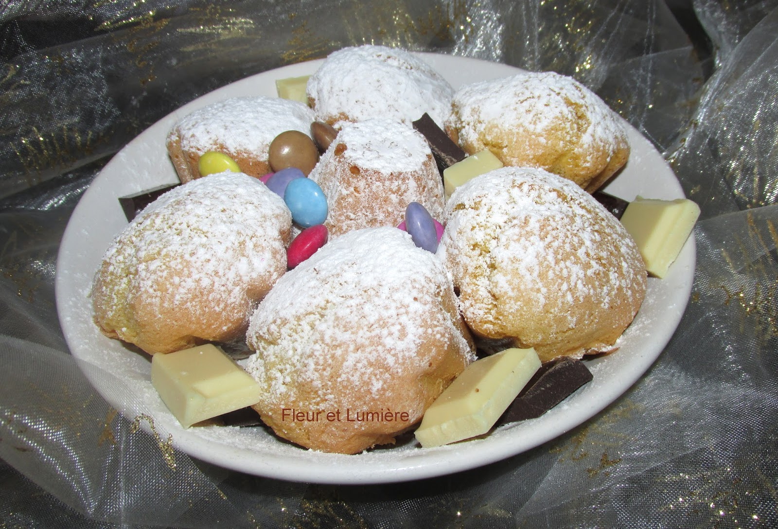 Muffins génoise, sucre glace, carrés de chocolat blanc et noir et smarties pour décorer un goûter très très simple ^^
